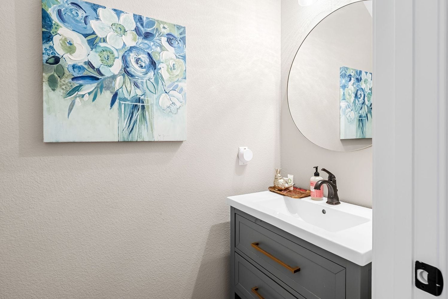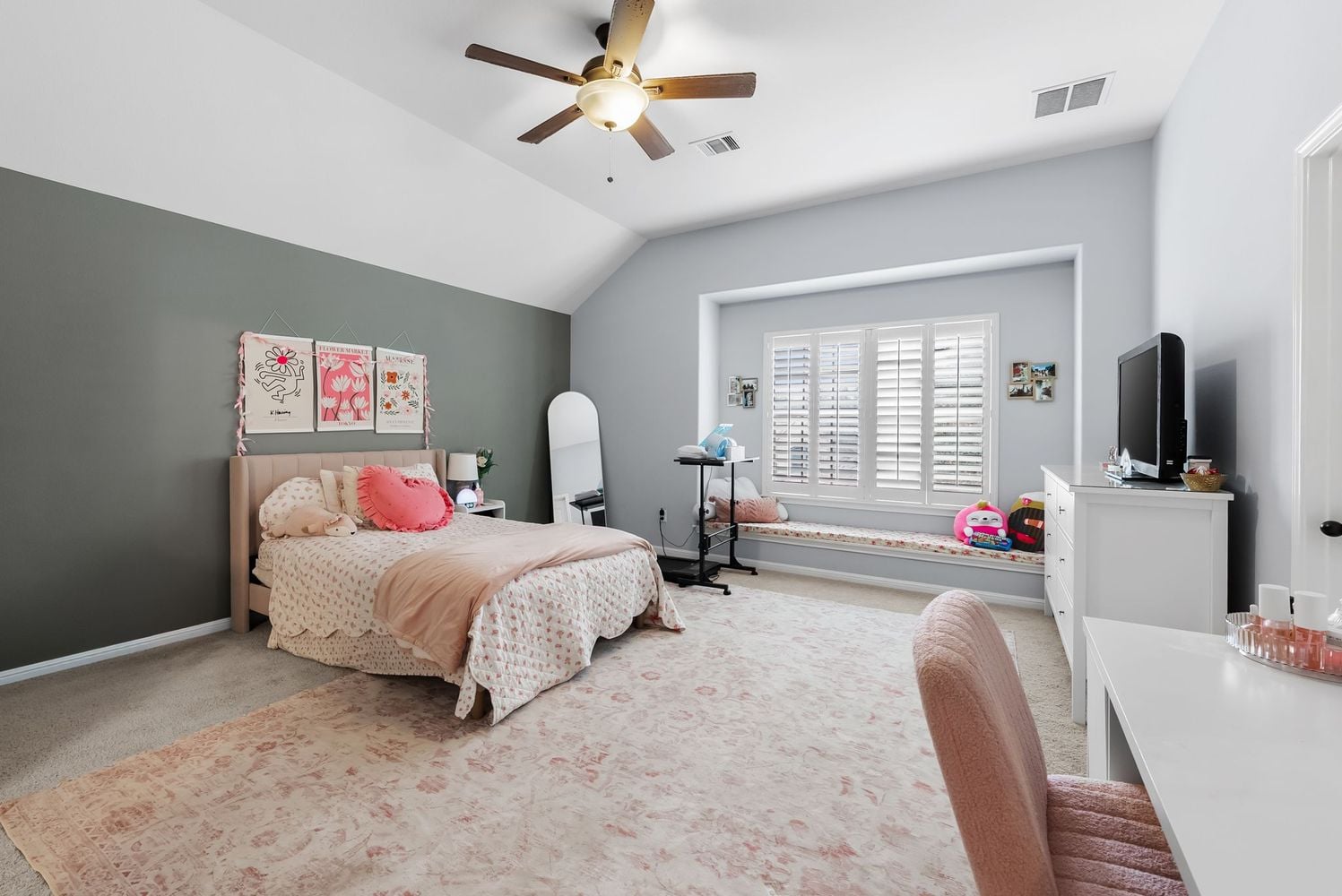 The primary suite is located on the main level and includes bay windows that extend the room and create a comfortable sitting or reading area. The ensuite bath features dual vanities with updated cabinetry and finishes.
