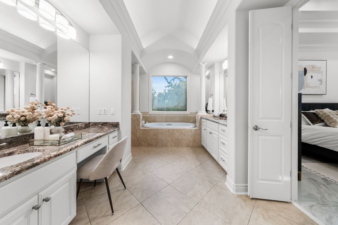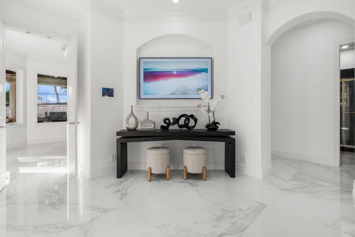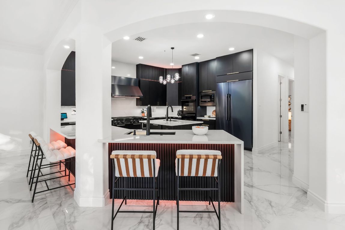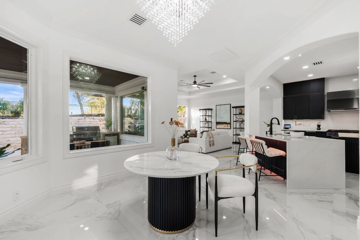 The kitchen is a centerpiece of the home, featuring professional-grade Dacor smart appliances, including a steam double convection oven, smart rangetop, wall hood, dishwasher, and double-column refrigerator with remote viewing. Custom backsplash, black stainless finishes, and a crystal chandelier add polish and sophistication. Every system is integrated — lighting, audio, pool, and security — all controlled by built-in tablets or by voice through Alexa, Google Home, or Apple.