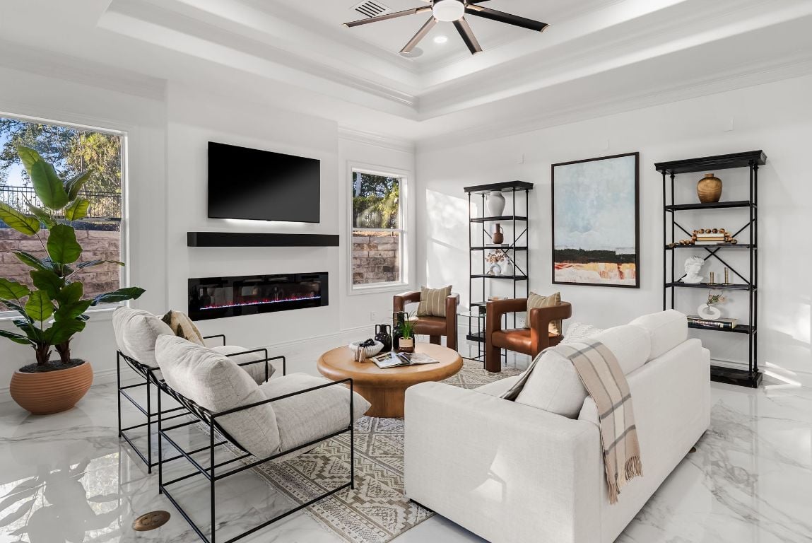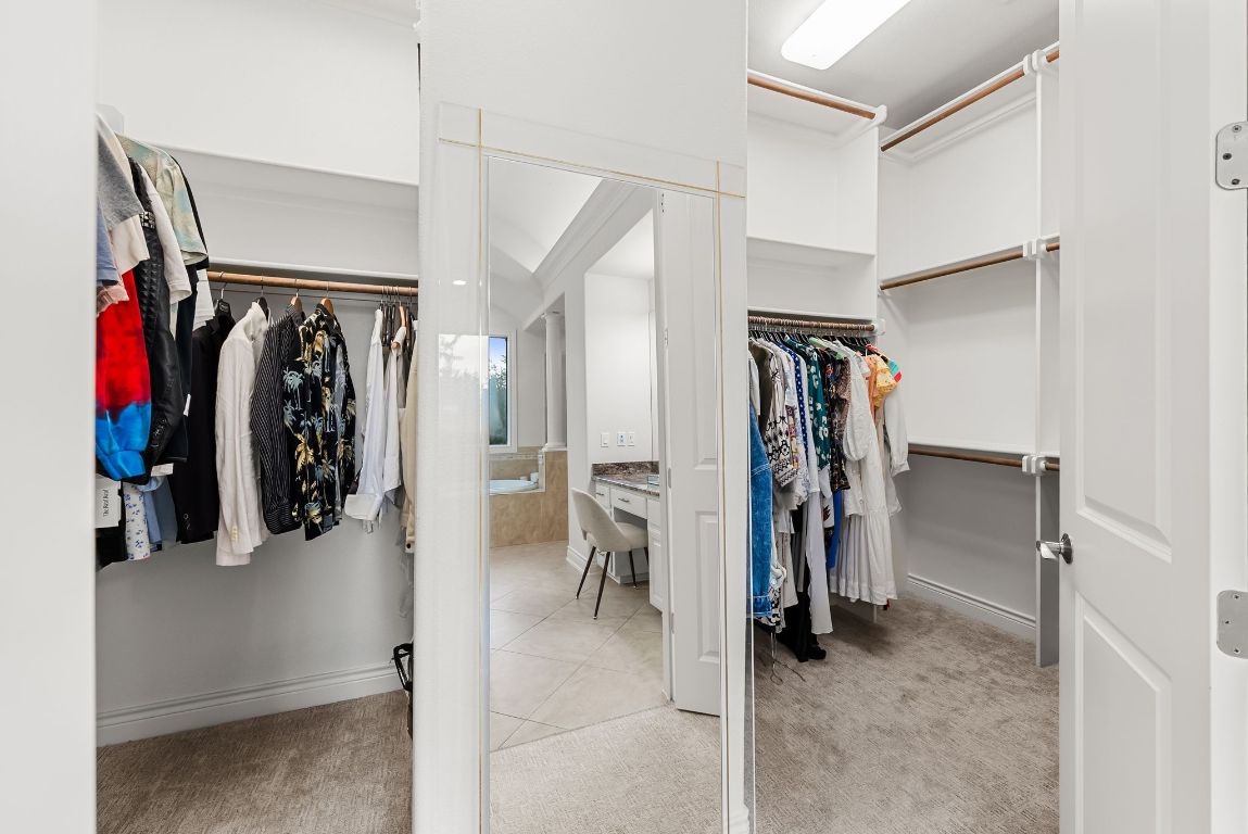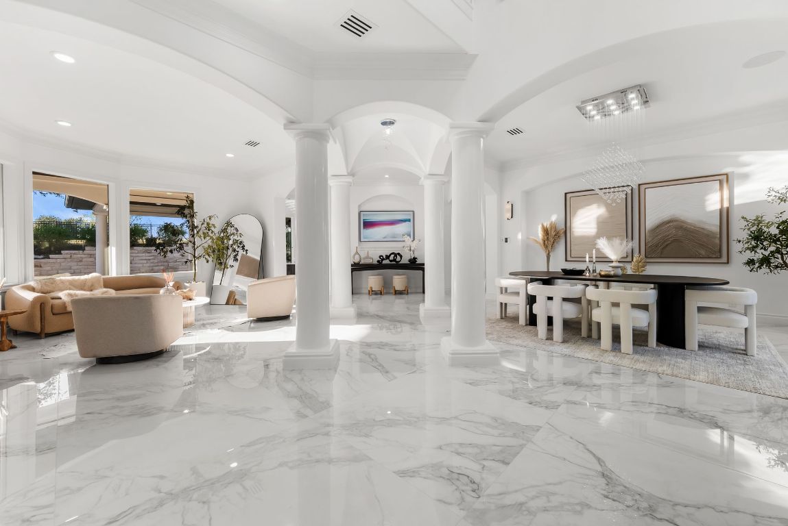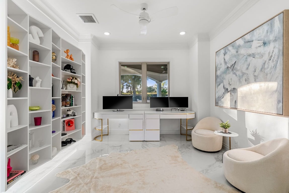 The kitchen is a centerpiece of the home, featuring professional-grade Dacor smart appliances, including a steam double convection oven, smart rangetop, wall hood, dishwasher, and double-column refrigerator with remote viewing. Custom backsplash, black stainless finishes, and a crystal chandelier add polish and sophistication. Every system is integrated — lighting, audio, pool, and security — all controlled by built-in tablets or by voice through Alexa, Google Home, or Apple.