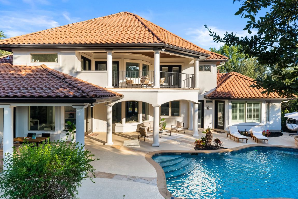 The main level includes a spacious primary suite and a full guest suite with its own bath, ideal for flexible or multigenerational living. Upstairs, three additional bedrooms, two full baths, and a grand balcony offer space for guests or family. Outside, the pool, spa, and cascading waterfall are surrounded by mature landscaping that enhances the sense of calm and connection.